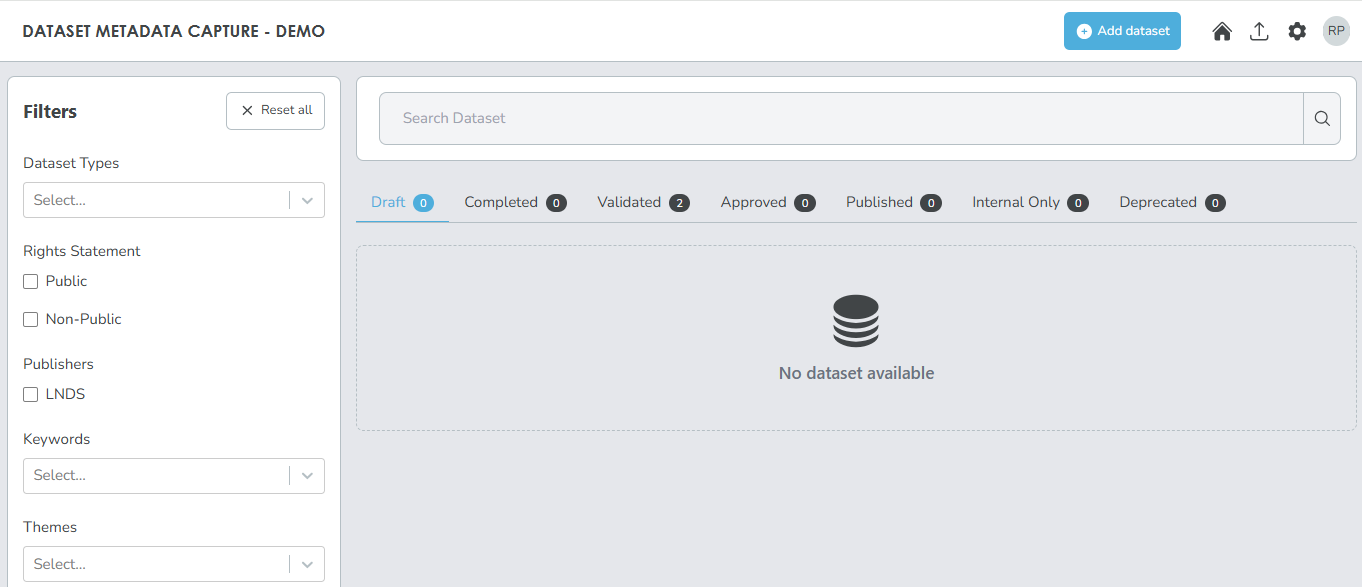 The Metadata Capture dashboard is the default view of the working area, where you can manage and view datasets. Everything you see in the dashboard is specific to the organisation you select and the roles assigned to you within that organisation.
