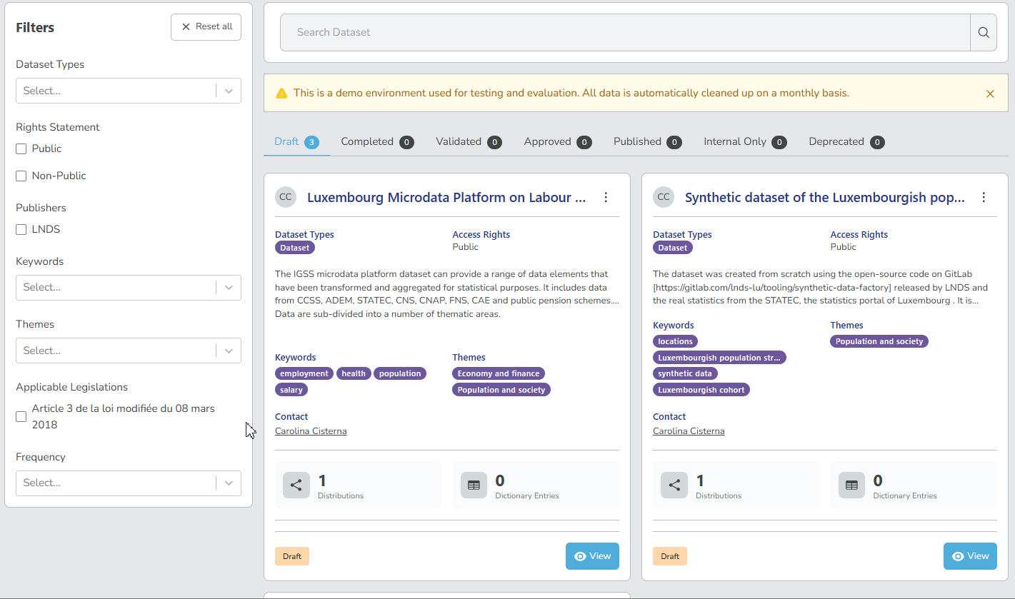 - Draft: Datasets that have been added or are being edited.