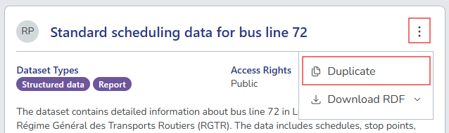 Duplicate datasets to quickly create an independent copy of an existing dataset with all its metadata. Duplication is useful for creating templates or when you need to make similar datasets with minor variations. By duplicating, you save time by not having to re-enter all metadata from the start.