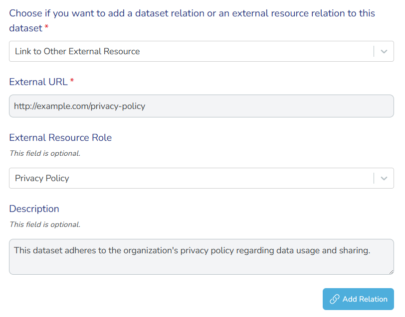 - Relations can connect to datasets within the platform or external URLs outside the platform