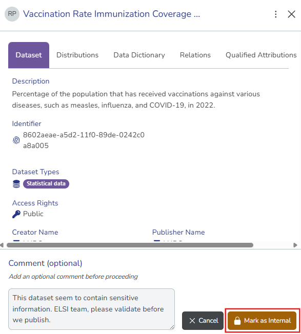 (Optional) Enter your comments explaining why you are marking the dataset as internal, to provide context to other collaborators.