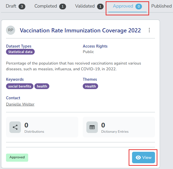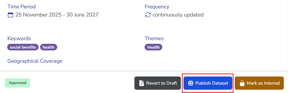 After a dataset is approved, you can either publish it publicly or mark it as internal. Publishing datasets publicly makes them visible beyond your organisation. This allows users from other organisations in your ecosystem to search and discover the datasets.