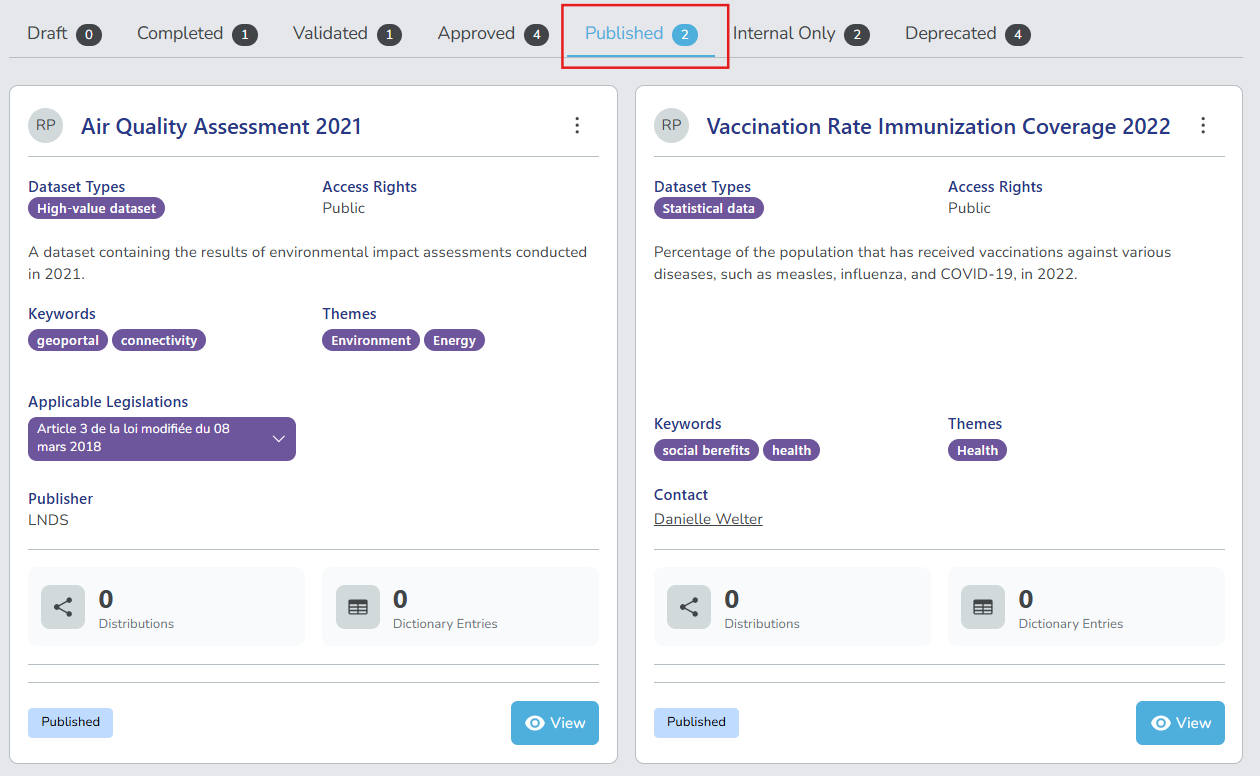 After the dataset is published, it appears in the Published tab and is available to users outside your organisation.